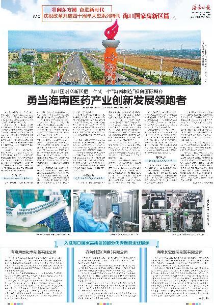 海南長安國際制藥有限公司榮登2018年12運27日《海南日報》A10版慶祝改革開放四十周年大型系列特刊海口國家高新區篇“勇當海南醫藥產業創新發展領跑者”一欄。詳細報道如下: