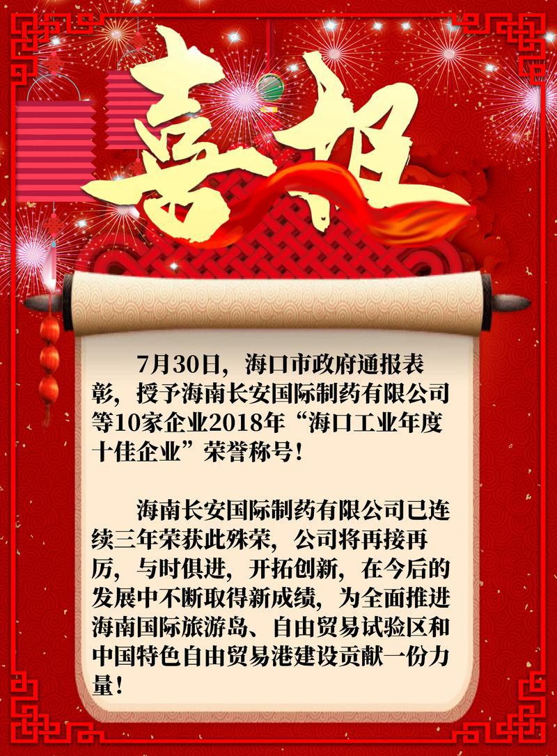 海南長安國際制藥有限公司榮獲2018年度海口工業十佳企業