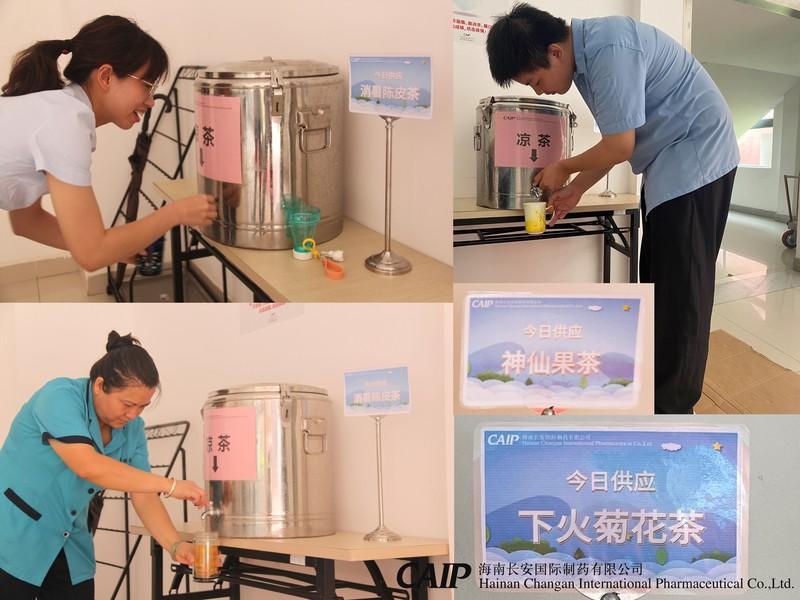 海南已經(jīng)進(jìn)入了炎炎夏日,長(zhǎng)安制藥為了關(guān)愛(ài)員工,決定在6月到10月,每周一、 周五推出了自行配制的特色涼茶,有生津止渴的下火菊花茶,有用羅漢果熬制的神仙果茶,消暑陳皮茶,鴛鴦藤煮的金銀消暑露等,供員工們免費(fèi)飲用,把關(guān)懷、關(guān)愛(ài)送到眾多員工心中,給一直默默堅(jiān)守在工作崗位的員工們帶去獨(dú)特的清涼和消暑模式。