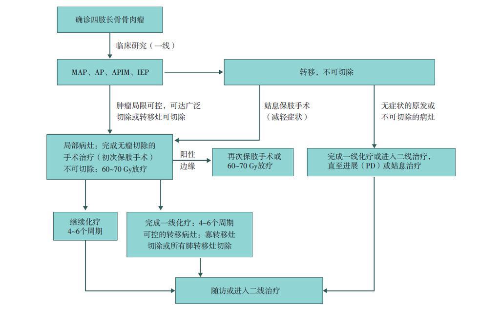 保肢治療指經(jīng)典型骨肉瘤在多學科團隊醫(yī)生共同努力下完成的新輔助化療、保肢手術(shù)和輔助化療等一系列治療總稱,其目的是在提高患者生存率的前提下,減少局部復發(fā)、盡量保留良好的肢體功能。肢體經(jīng)典型骨肉瘤保肢治療方法如下圖所示: